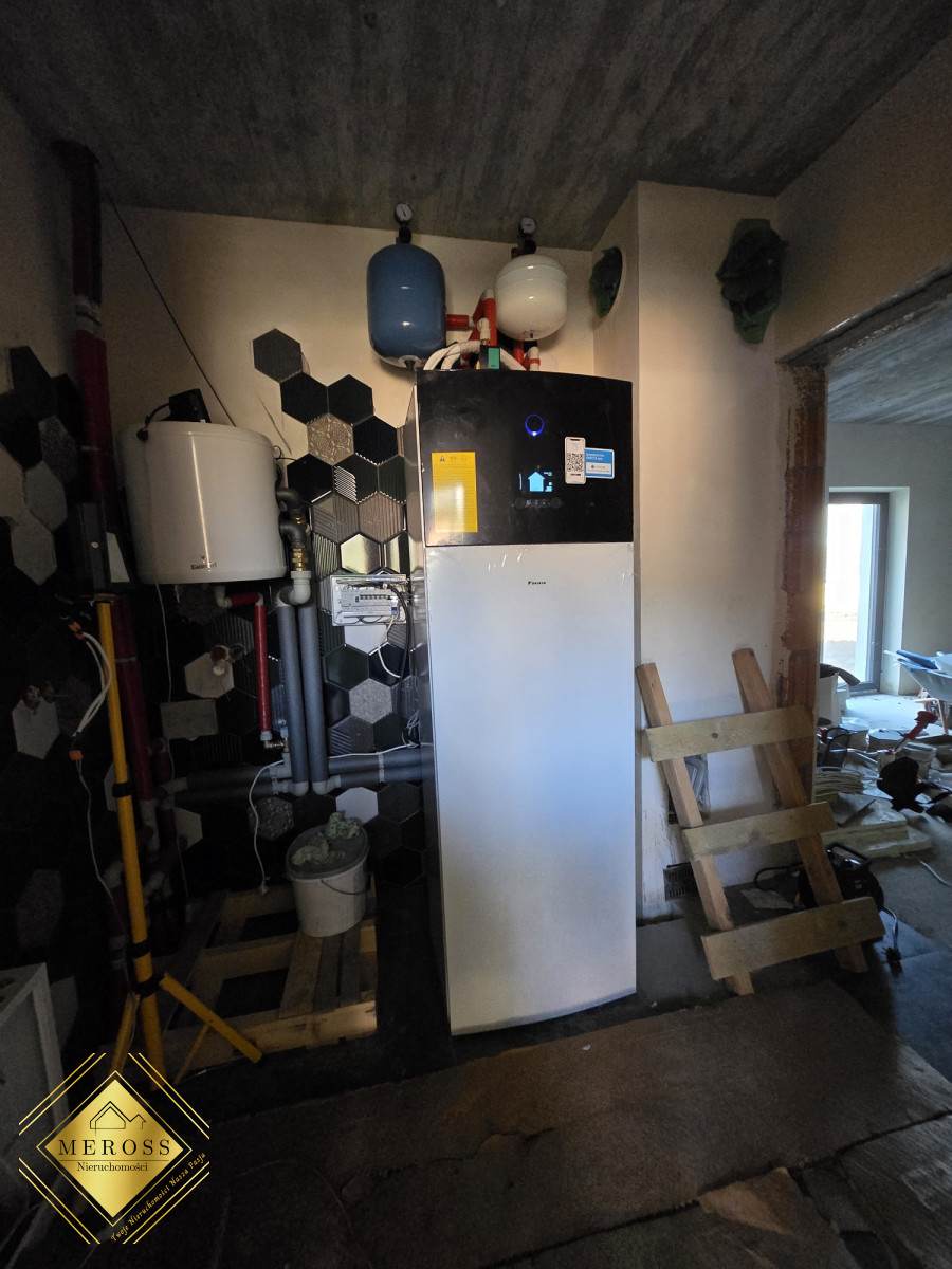 Ogrzewanie podłogowe, pompa ciepła, duże przeszklenia. W domu poprowadzona instalacja elektryczna wraz z umową o przyłącze. Instalacja wodna doprowadzona do budynku, zgoda na przydomową oczyszczalnię ścieków lub szambo. Dach dwuspadowy pokryty blachodachówką.