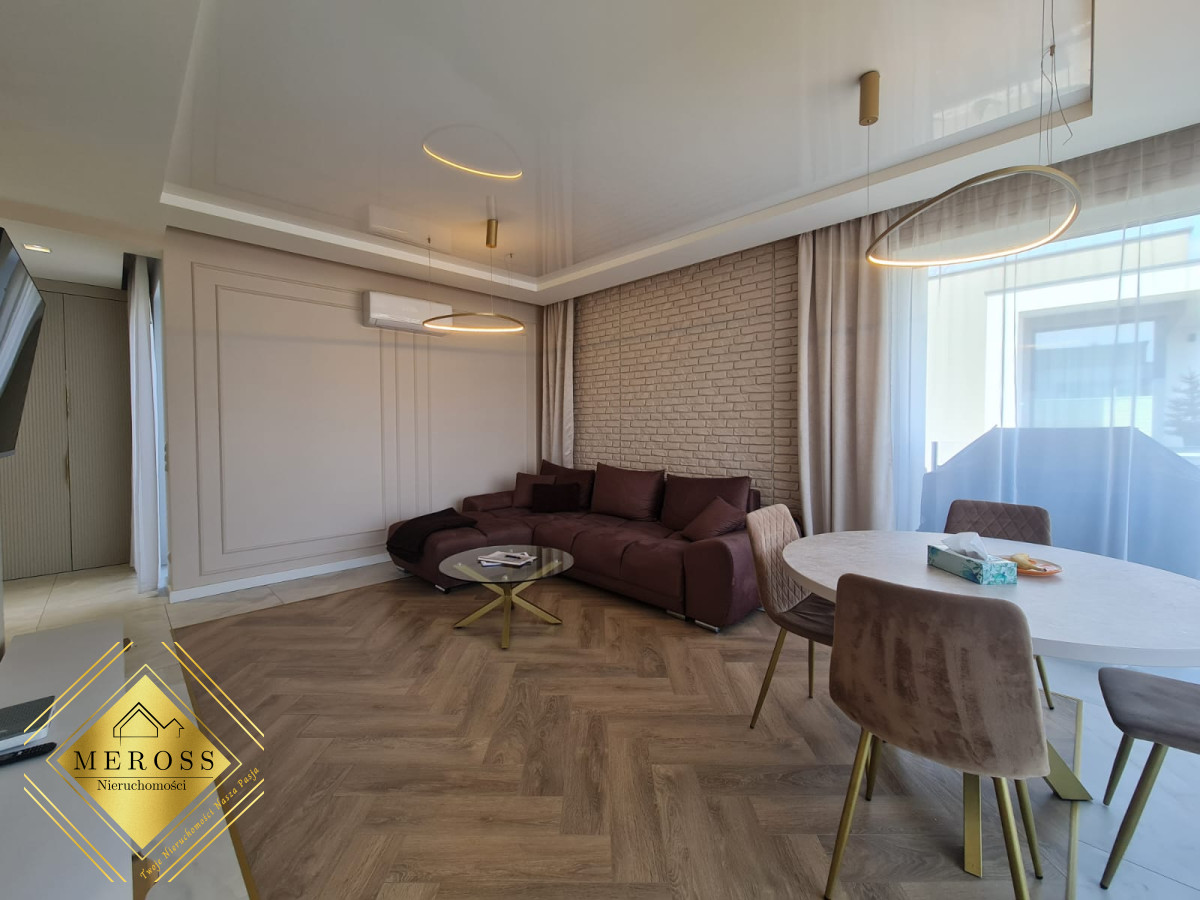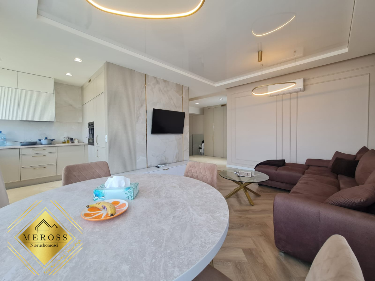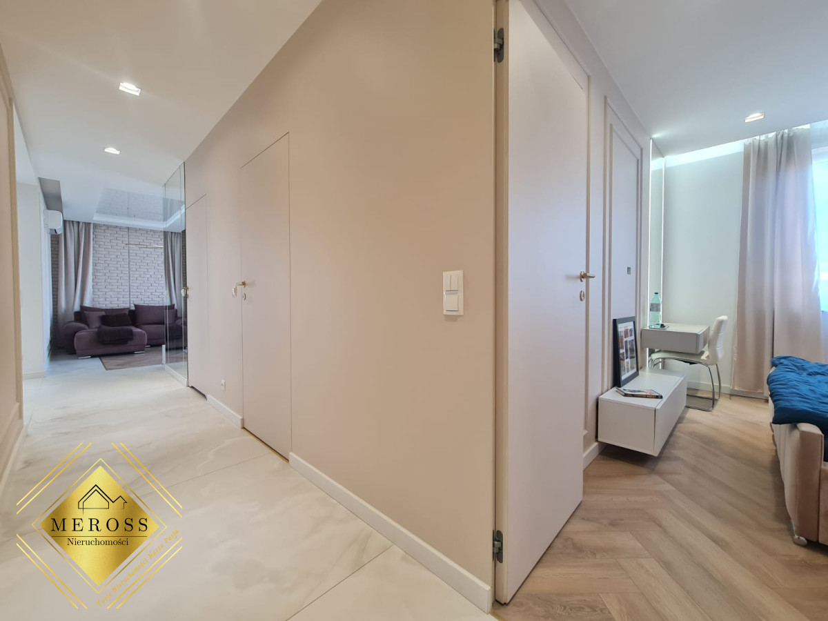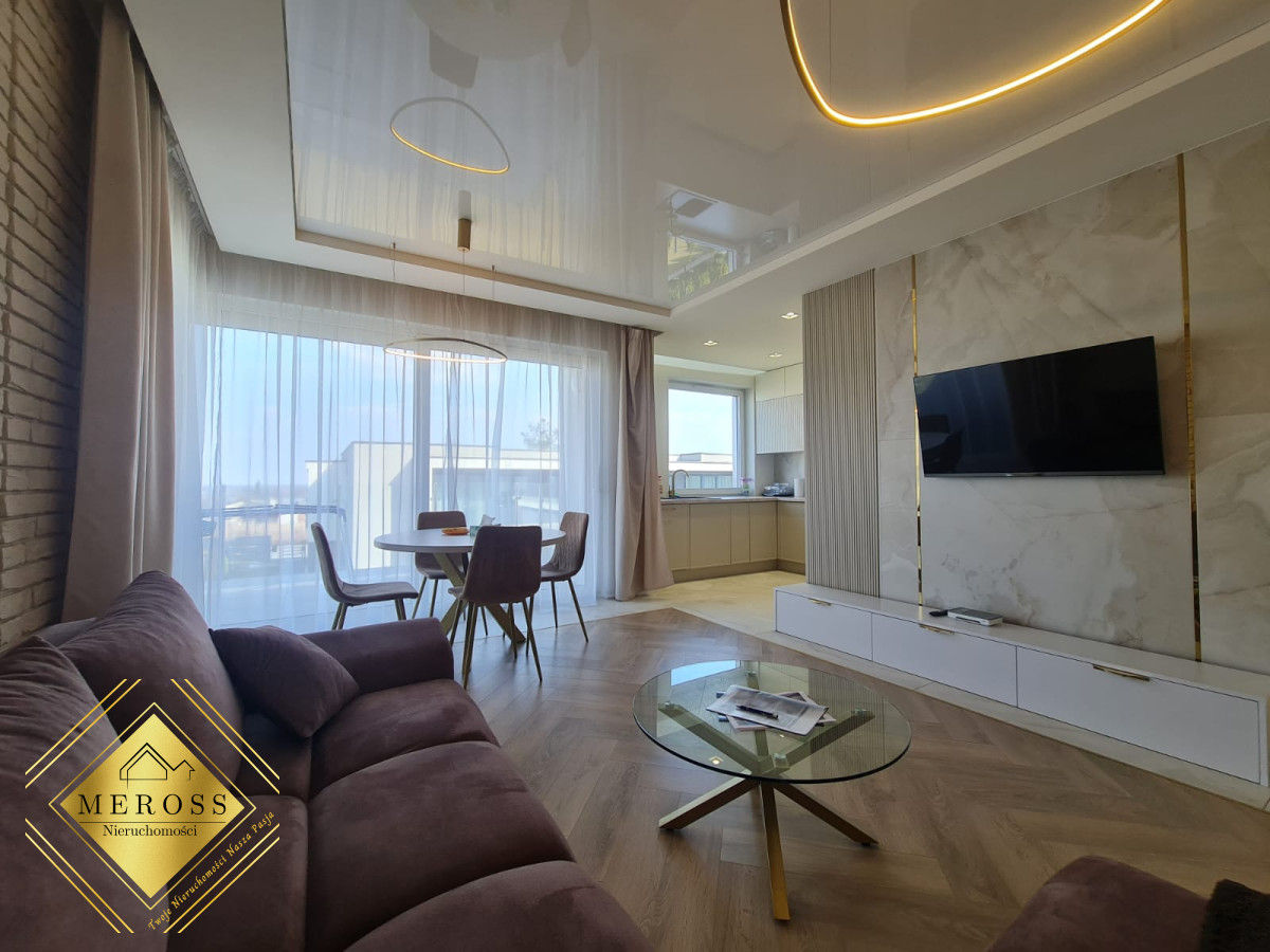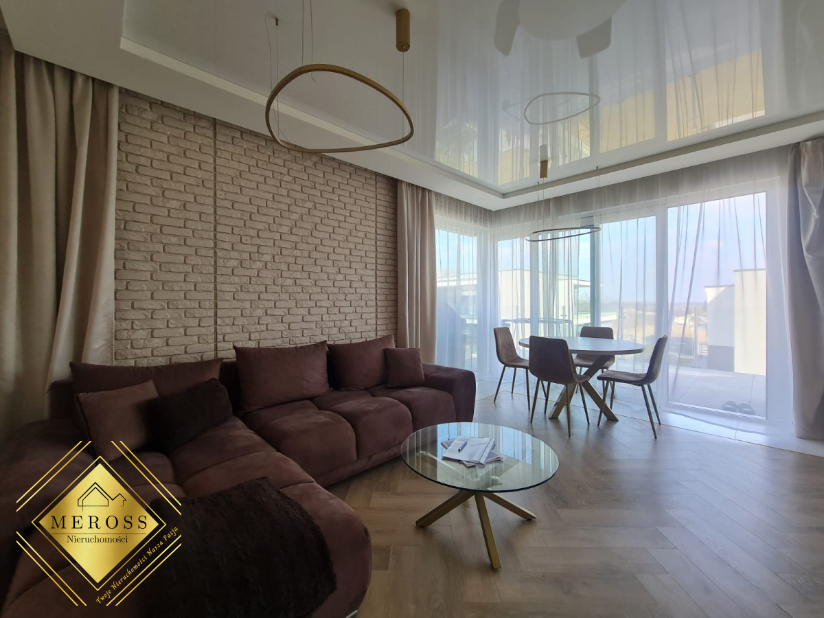 Składa się z przestronnego salonu z aneksem kuchennym, dwóch ustawnych sypialni (w tym jedna bardzo duża), garderoby, dwóch łazienek oraz przedpokoju, schowka, klatki schodowej. W mieszkaniu ogrzewanie podłogowe oraz klimatyzacja. Okna posiadają żaluzje zewnętrzne sterowane automatycznie. Mieszkanie posiada duży taras. Osiedle zamknięte i monitorowane.
