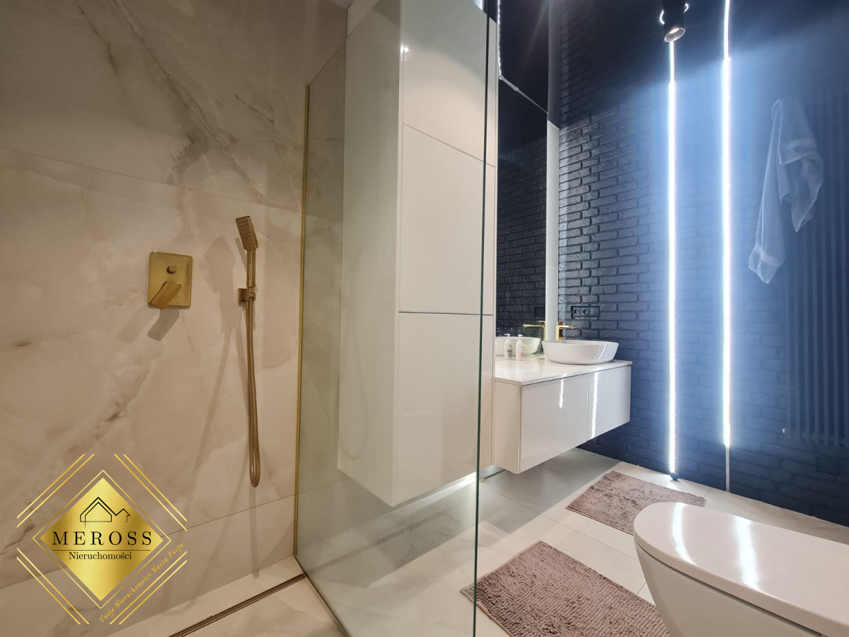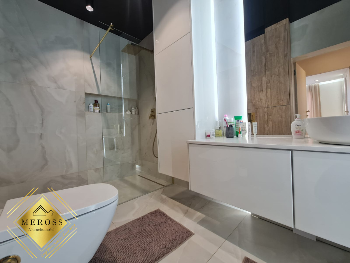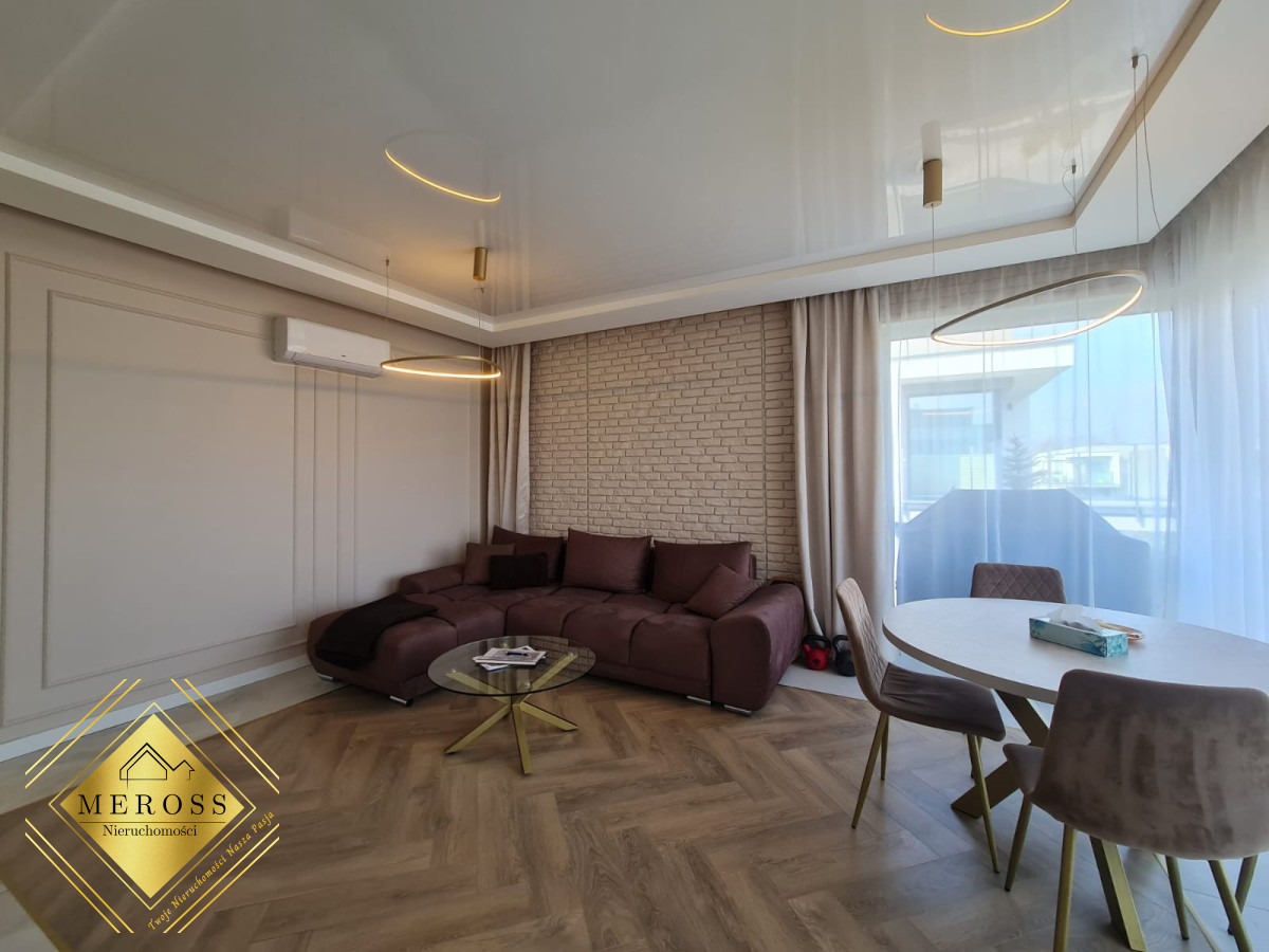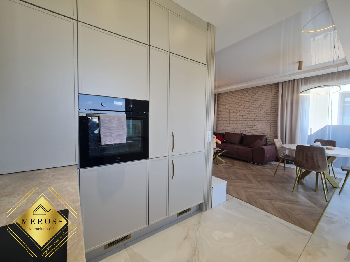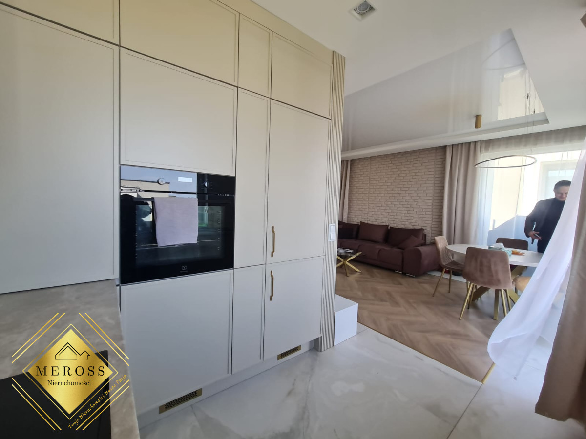 Składa się z przestronnego salonu z aneksem kuchennym, dwóch ustawnych sypialni (w tym jedna bardzo duża), garderoby, dwóch łazienek oraz przedpokoju, schowka, klatki schodowej. W mieszkaniu ogrzewanie podłogowe oraz klimatyzacja. Okna posiadają żaluzje zewnętrzne sterowane automatycznie. Mieszkanie posiada duży taras. Osiedle zamknięte i monitorowane.
